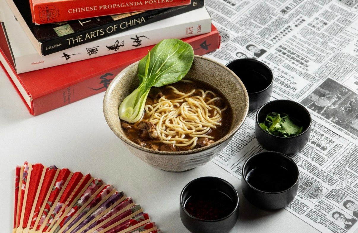 Суп на основе куриного бульона с яичной лапшой, подается с обжаренными на воке утиными косточками.
